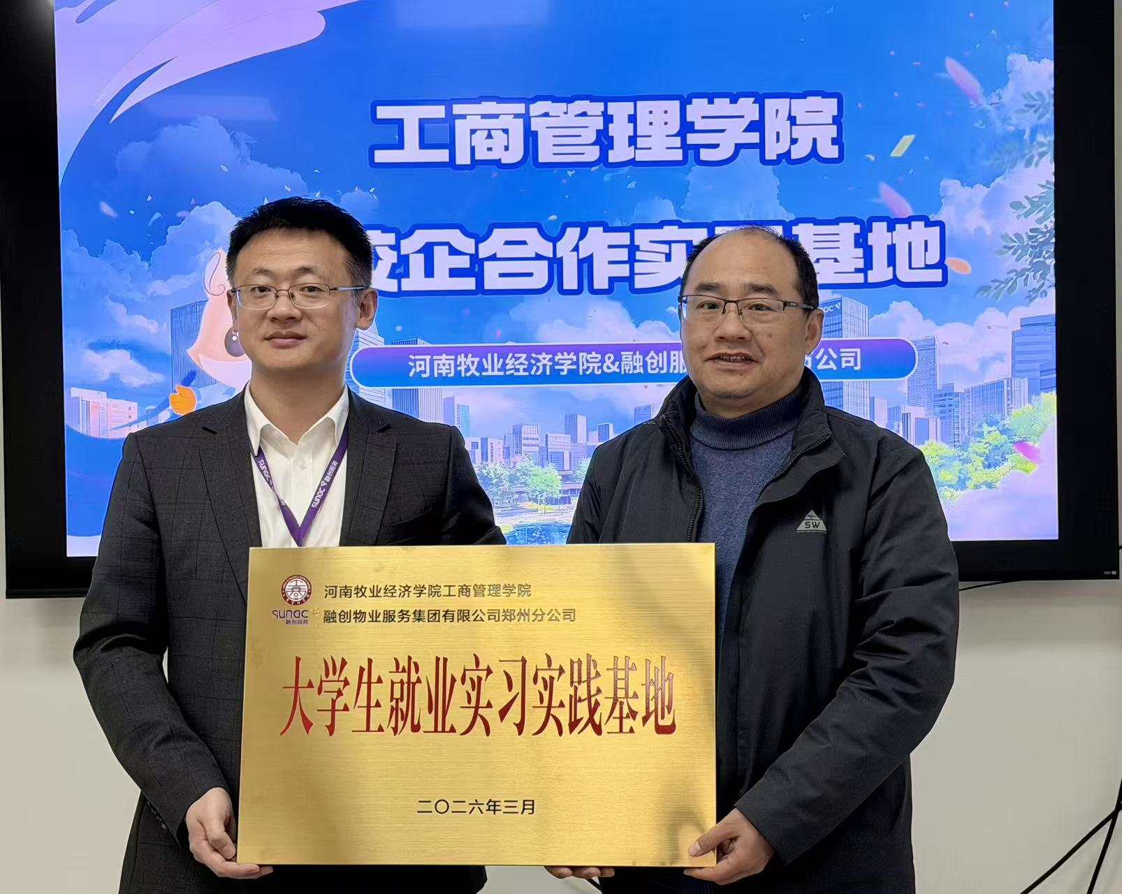 座谈交流尾声,校企双方举行隆重的签约及授牌仪式,学院与融创物业服务集团河南城市公司正式签署校企合作协议。副院长陈科和人力资源总经理郭国友代表双方进行签约,王国辉书记代表学院为企业授予“大学生就业实习实践基地”牌匾,标志着双方校企合作迈入实质性、常态化推进阶段,也为学院落实“双百工程”、搭建实践育人平台再添重要阵地。此次签约授牌,既为学院学生搭建了优质的实习实训、就业择业平台,助力学生提升实践能力、实现高质量就业,也为企业吸纳高素质人才、优化人才梯队提供了坚实保障,实现了高校育人与企业发展的双向赋能、互利共赢。